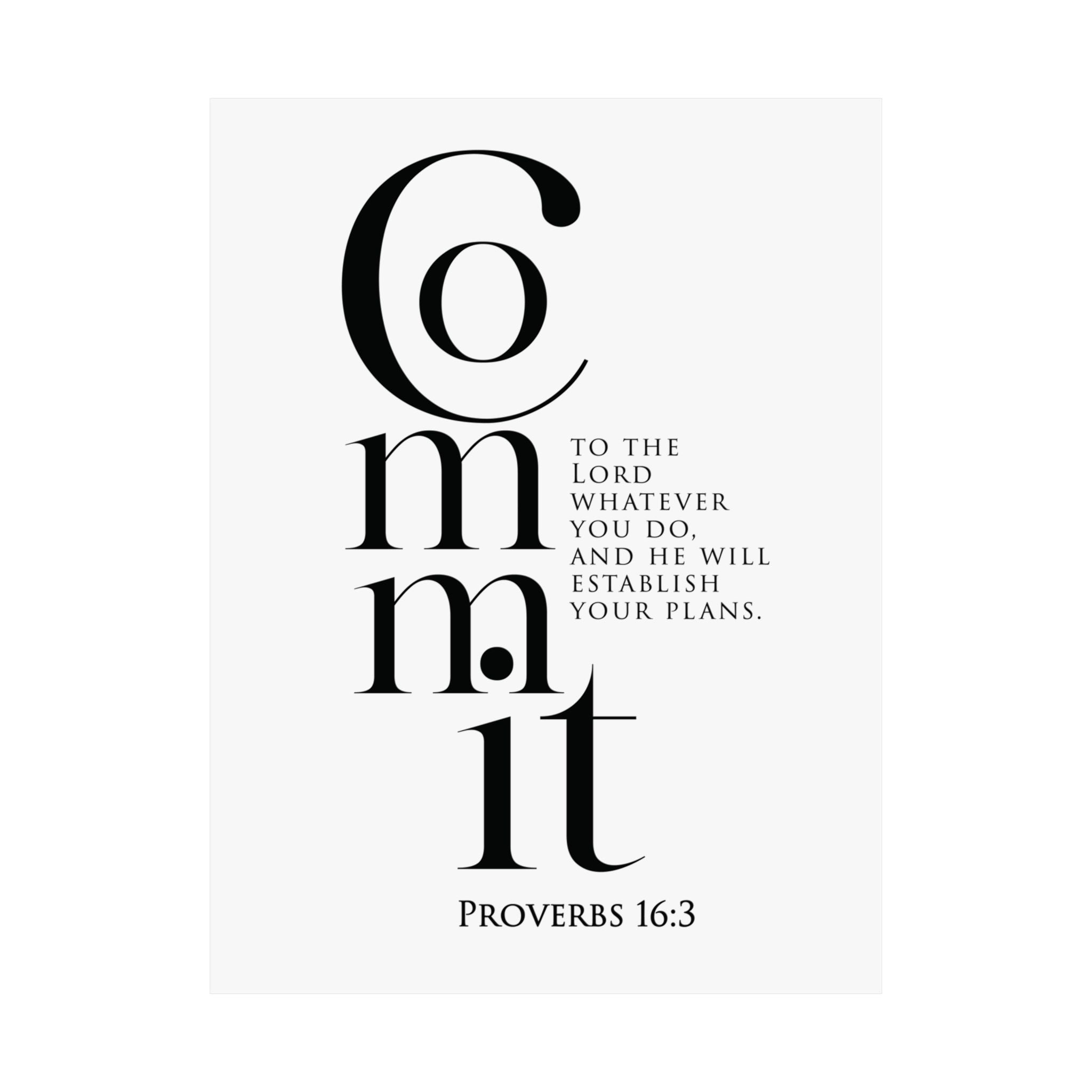 Bold and motivating, this matte vertical poster features “Commit” in oversized serif typography, paired with Proverbs 16:3: “Commit to the Lord whatever you do, and he will establish your plans.” The clean black and white composition feels modern, confident, and easy to style.