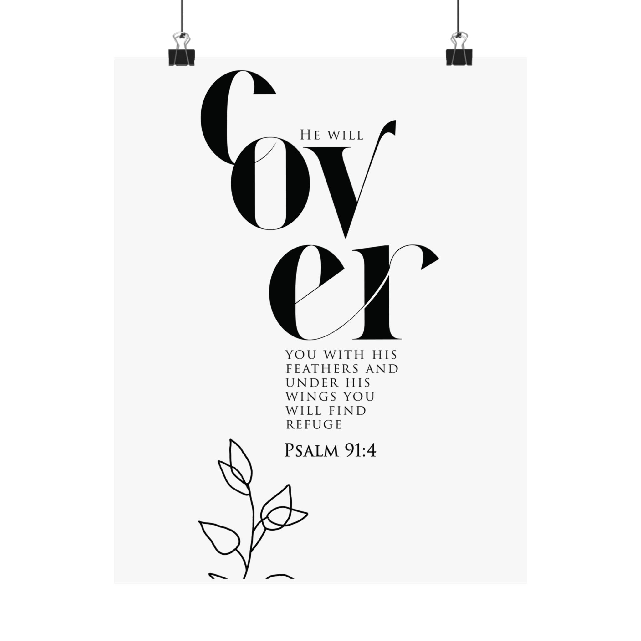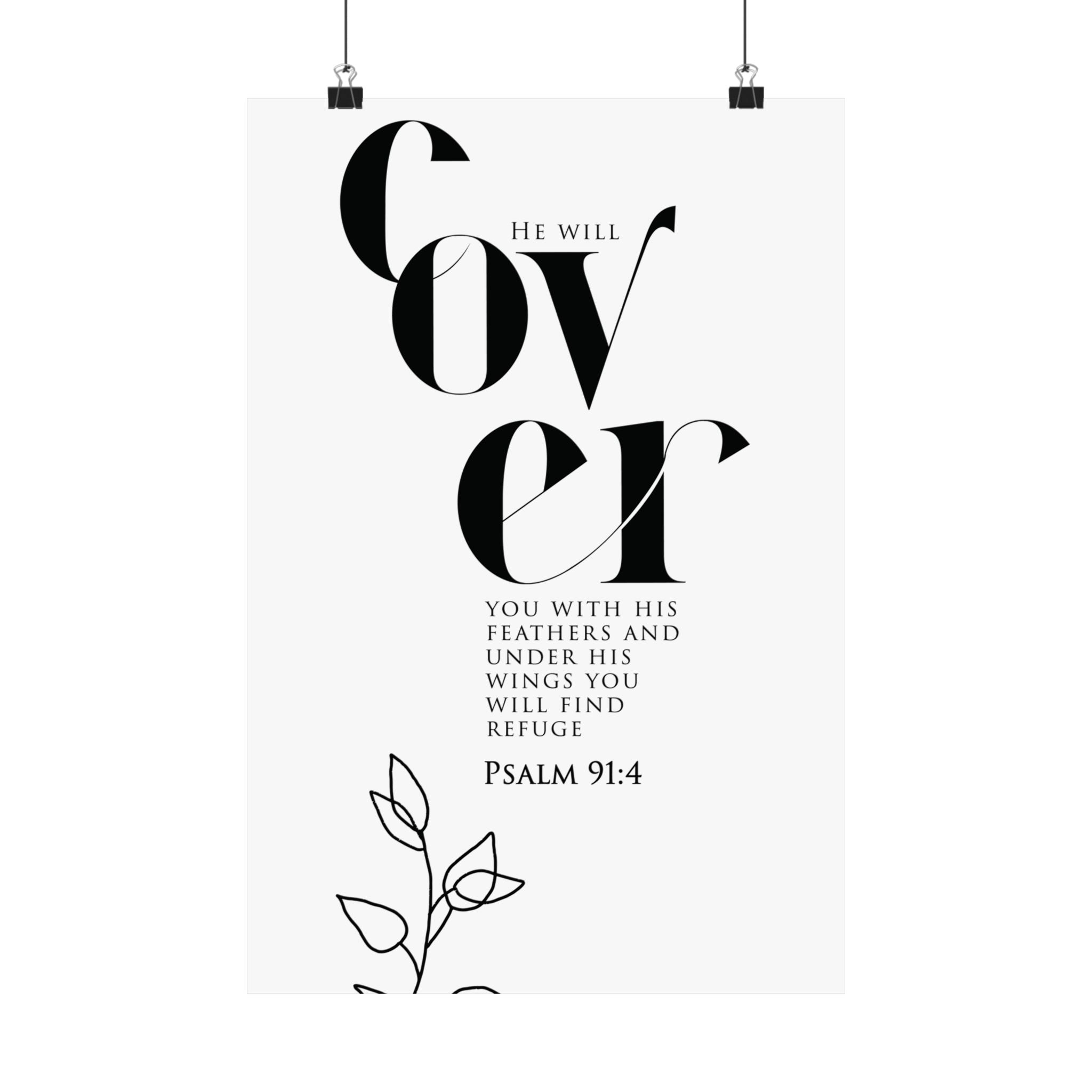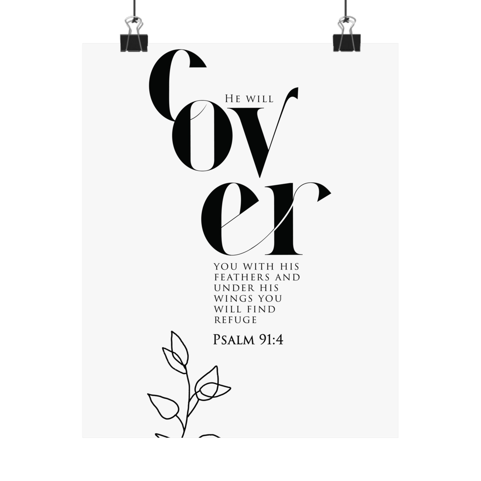 Comforting and calm, this matte vertical poster highlights “Cover” in striking typography with Psalm 91:4, reminding you of refuge under God’s wings. The minimalist black and white composition, paired with a delicate line art floral accent, brings a peaceful feel to bedrooms, nurseries, entryways, and quiet prayer spaces. A meaningful gift for someone in a season of healing, a housewarming, or anyone who needs a daily reminder of protection and rest. Museum grade paper and giclée printing keep every detail crisp and clear, while the matte finish stays soft and glare free. Available in 8 sizes for easy styling.