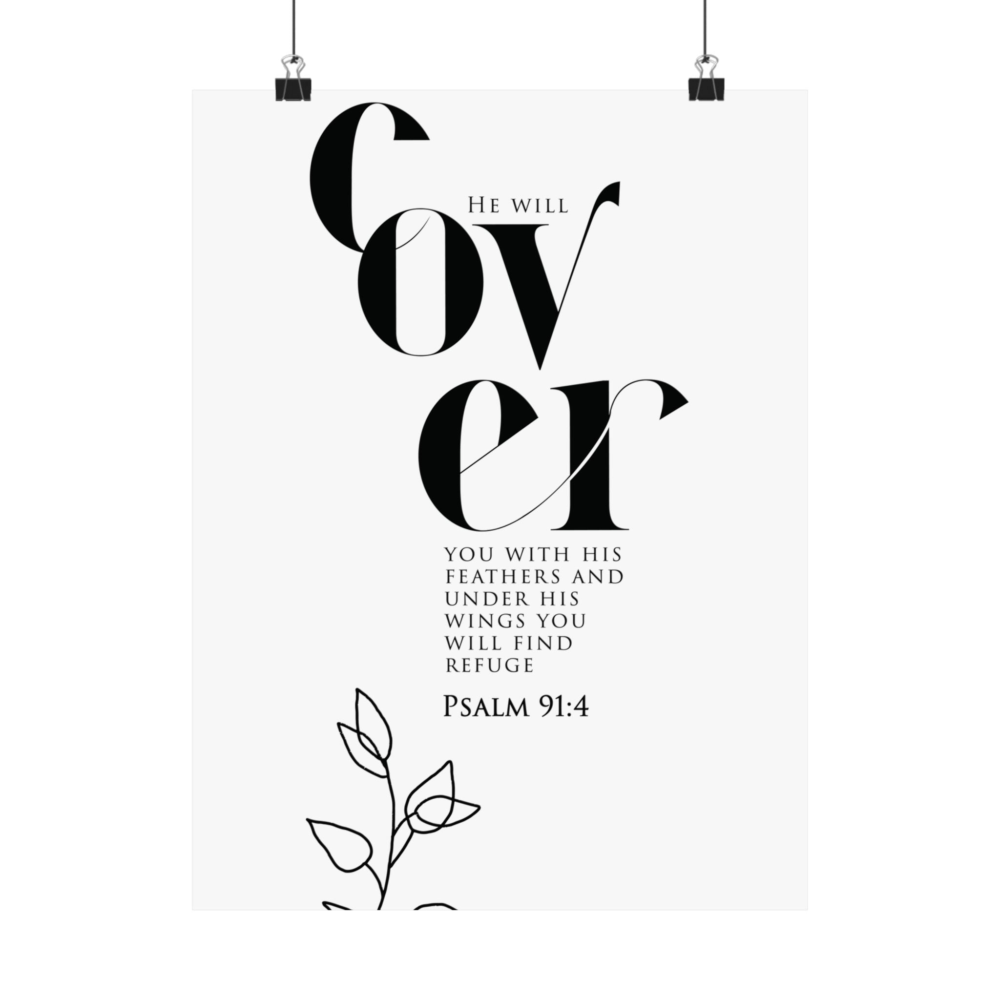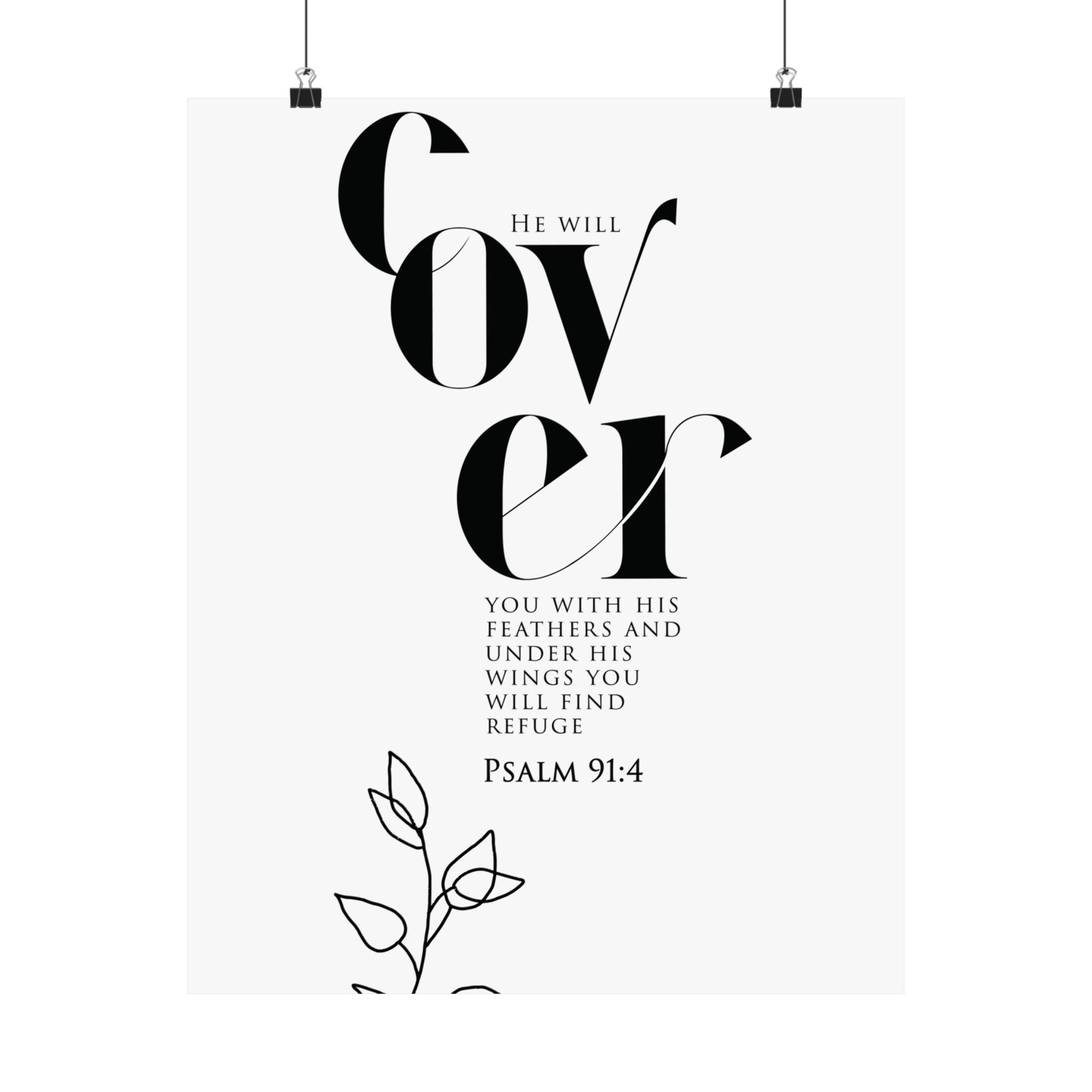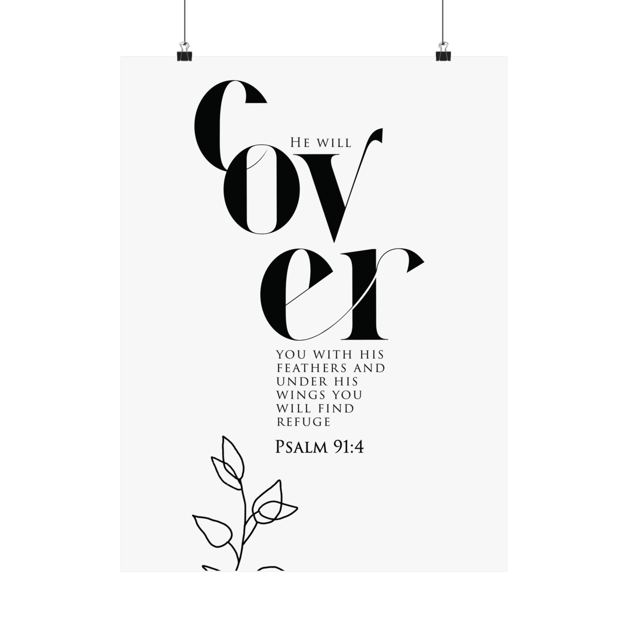 Comforting and calm, this matte vertical poster highlights “Cover” in striking typography with Psalm 91:4, reminding you of refuge under God’s wings. The minimalist black and white composition, paired with a delicate line art floral accent, brings a peaceful feel to bedrooms, nurseries, entryways, and quiet prayer spaces. A meaningful gift for someone in a season of healing, a housewarming, or anyone who needs a daily reminder of protection and rest. Museum grade paper and giclée printing keep every detail crisp and clear, while the matte finish stays soft and glare free. Available in 8 sizes for easy styling.