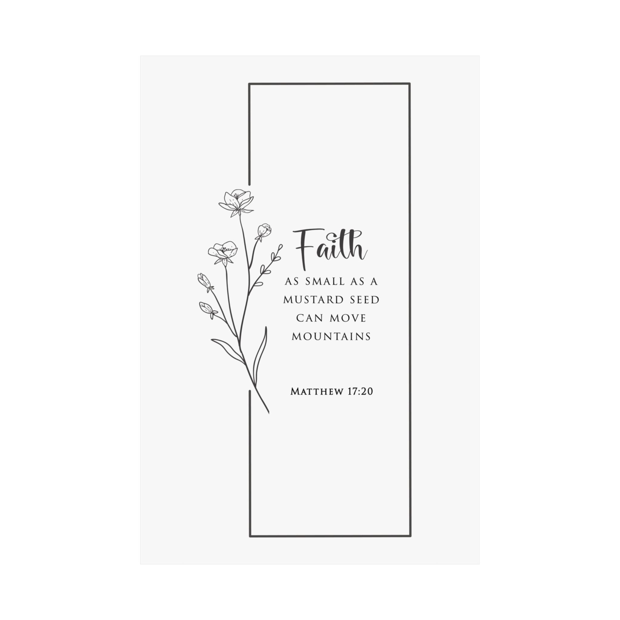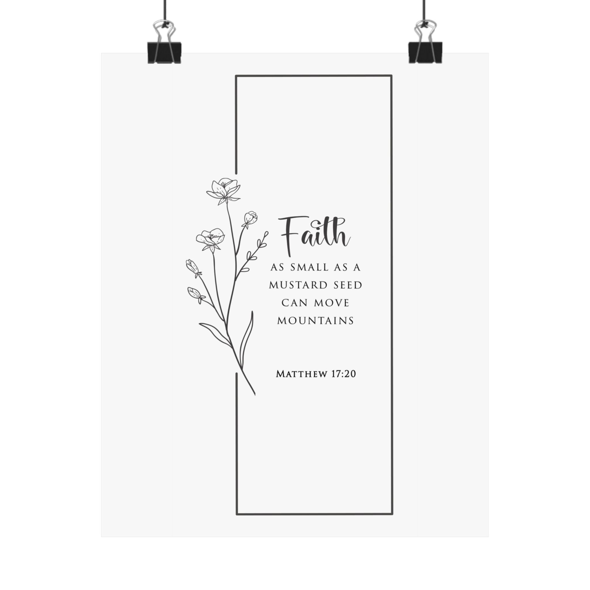 Bold and encouraging, this matte vertical poster features “Faith” in oversized script with the reminder that faith as small as a mustard seed can move mountains, paired with Matthew 17:20. The minimalist floral line art and clean typography make it a powerful statement without overwhelming your space.