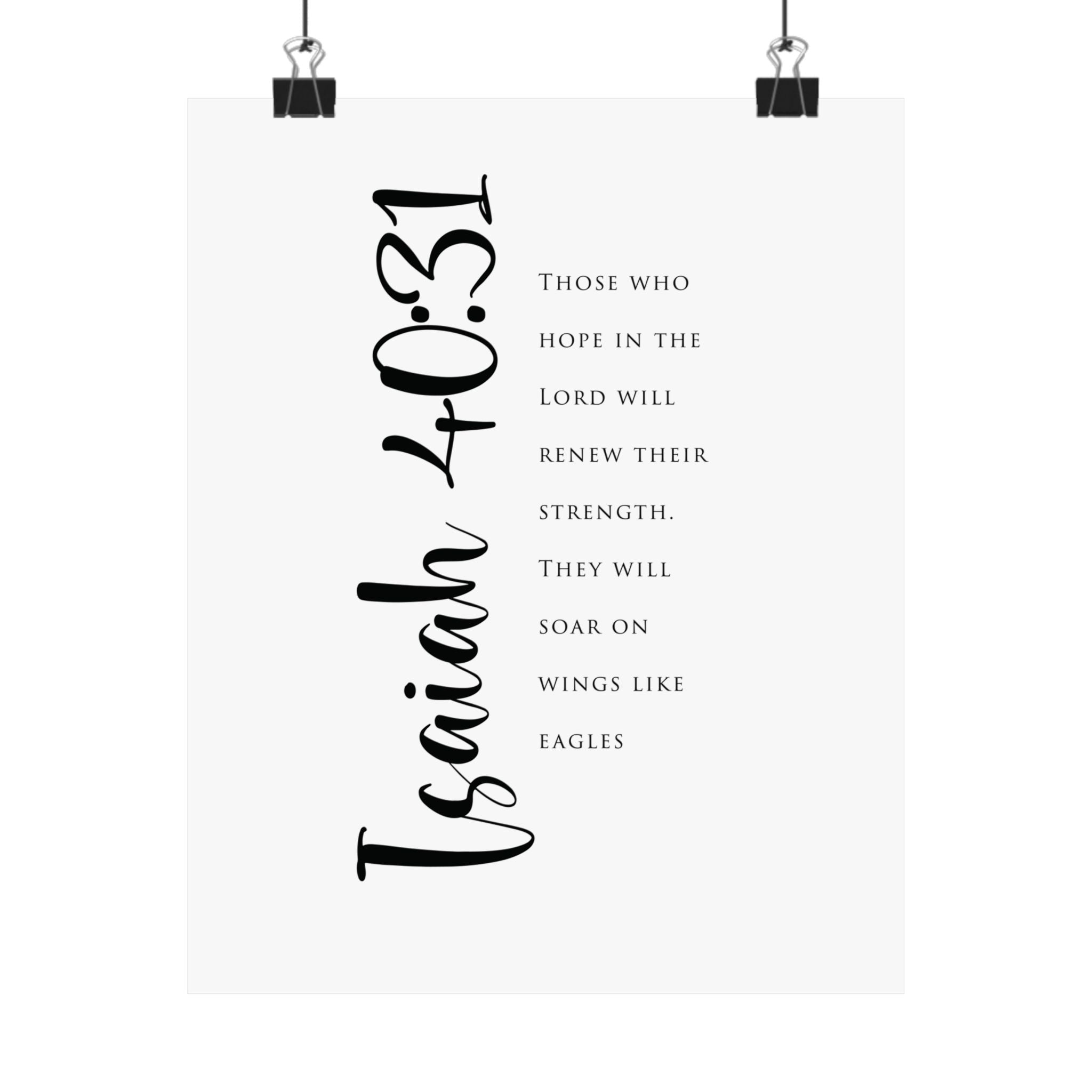 Hope filled and uplifting, this matte vertical poster features Isaiah 40:31: “Those who hope in the Lord will renew their strength. They will soar on wings like eagles.” The clean black and white typography with bold script details creates a strong statement for offices, gyms, bedrooms, and prayer corners. A meaningful gift for perseverance seasons, recovery journeys, and anyone trusting God for fresh strength. Museum grade paper and giclée printing keep the details crisp and rich, while the matte finish stays soft and glare free. Available in 8 sizes.