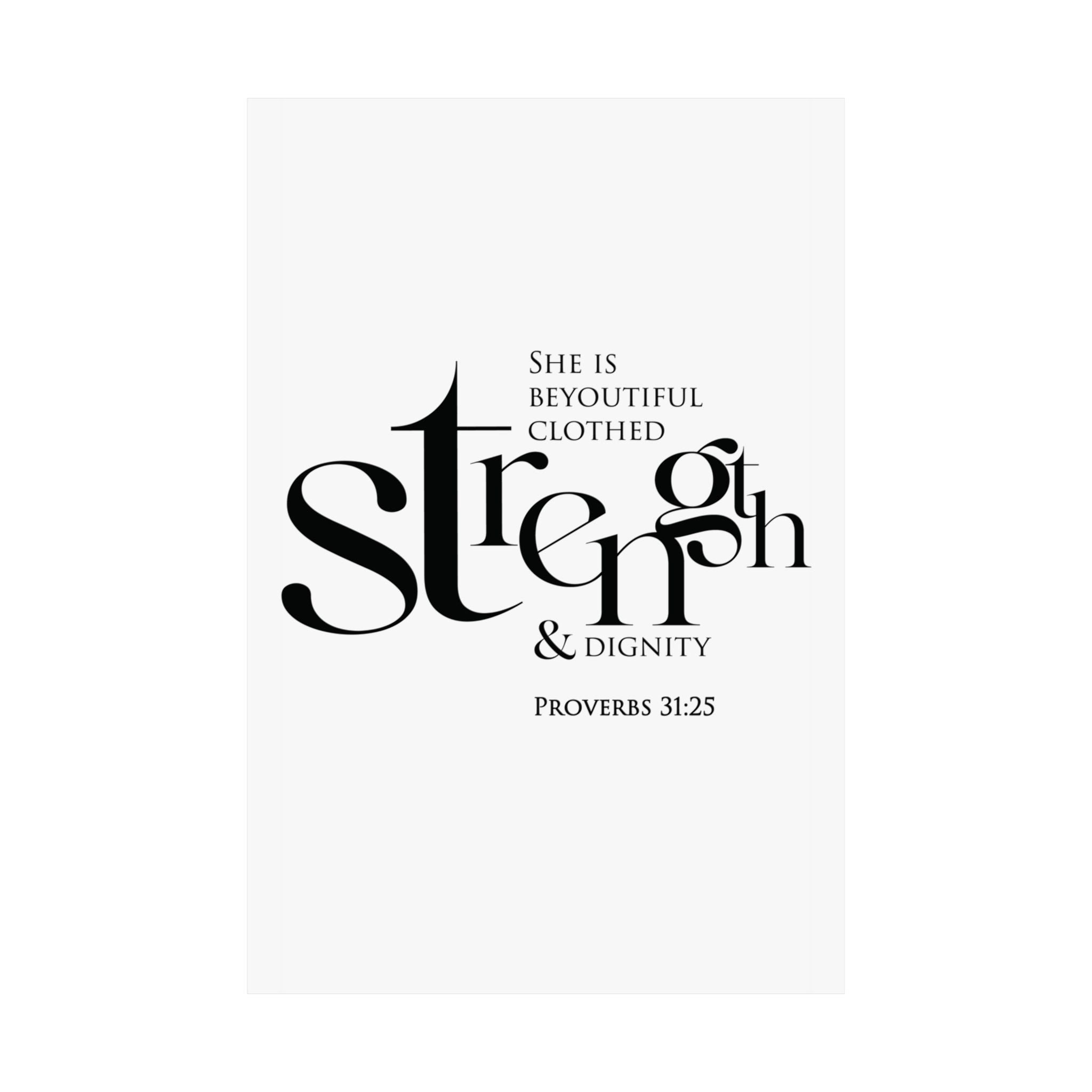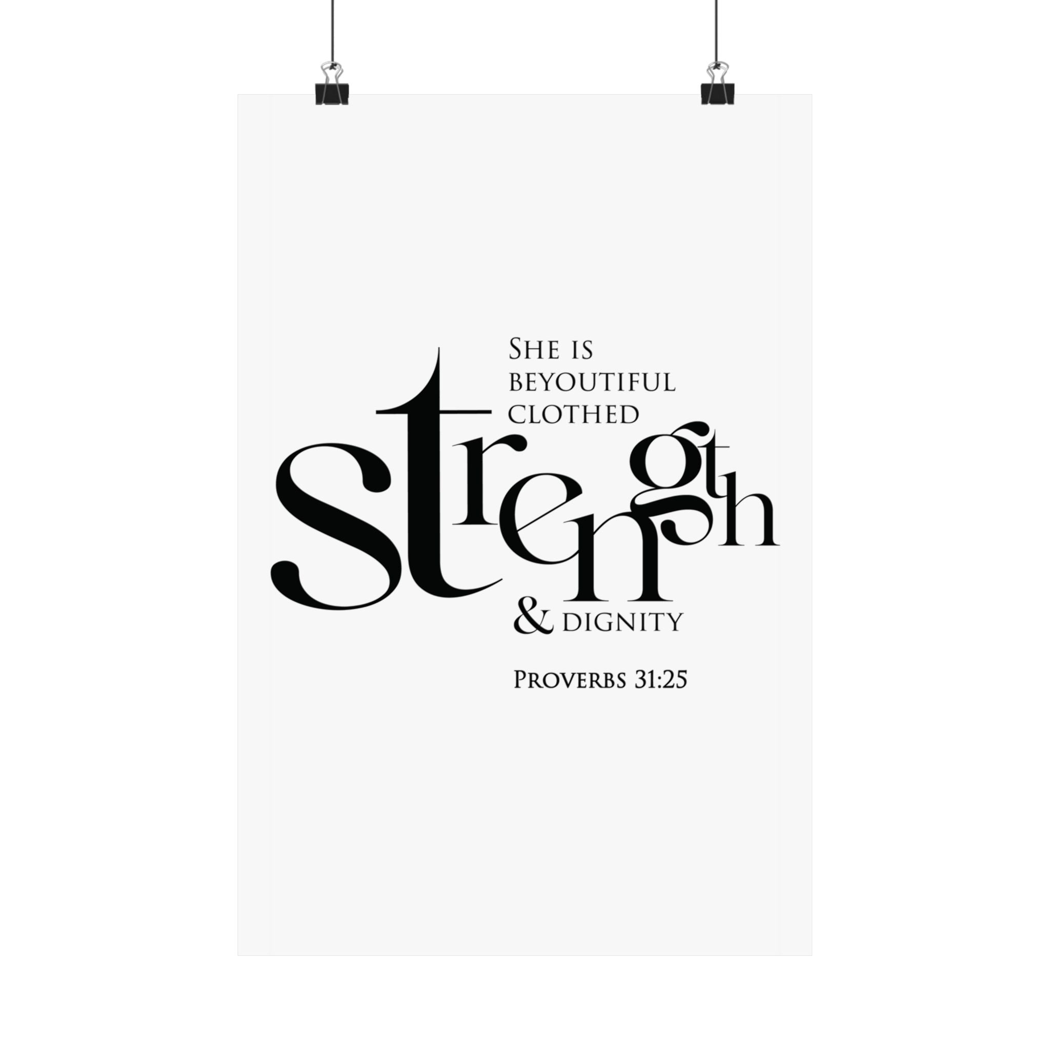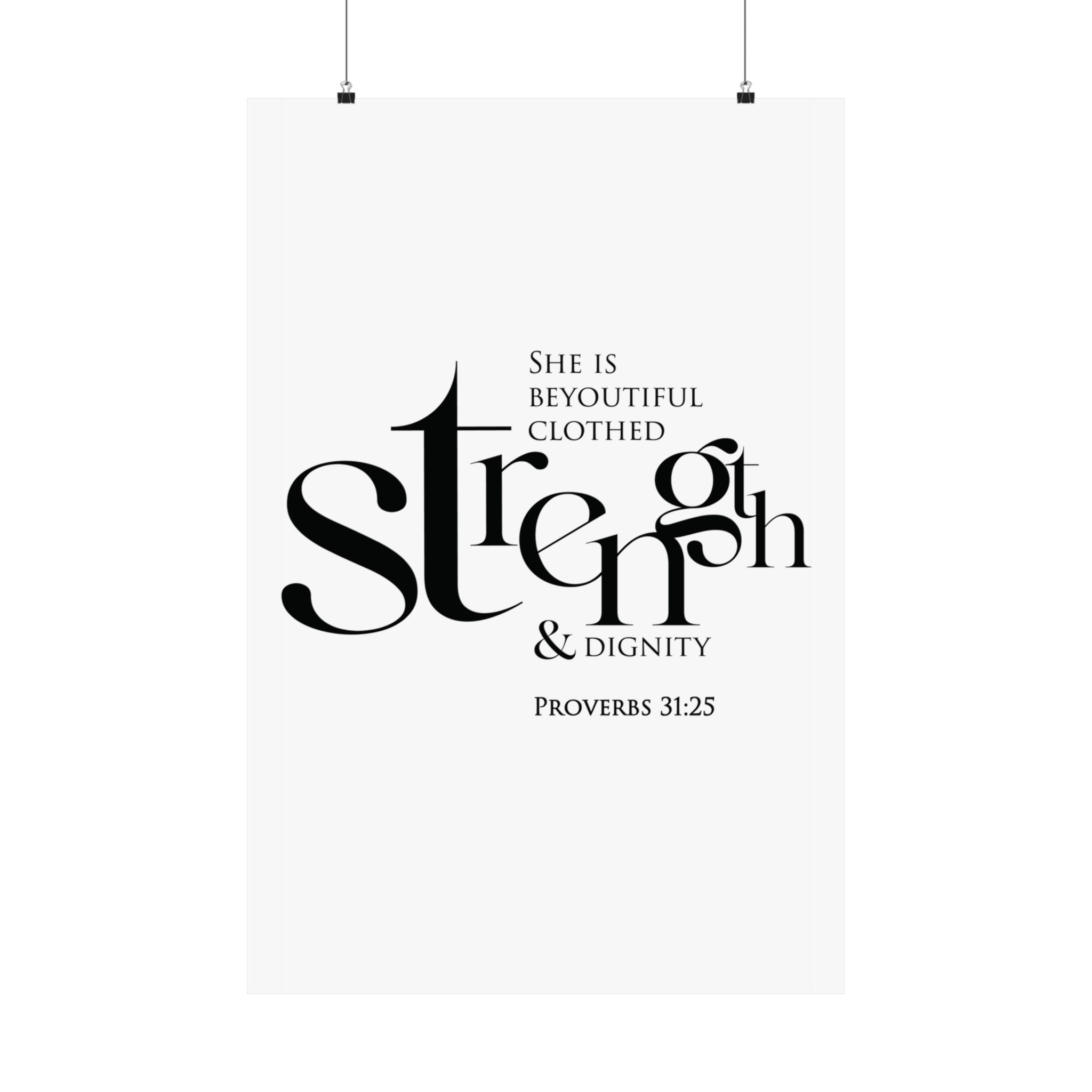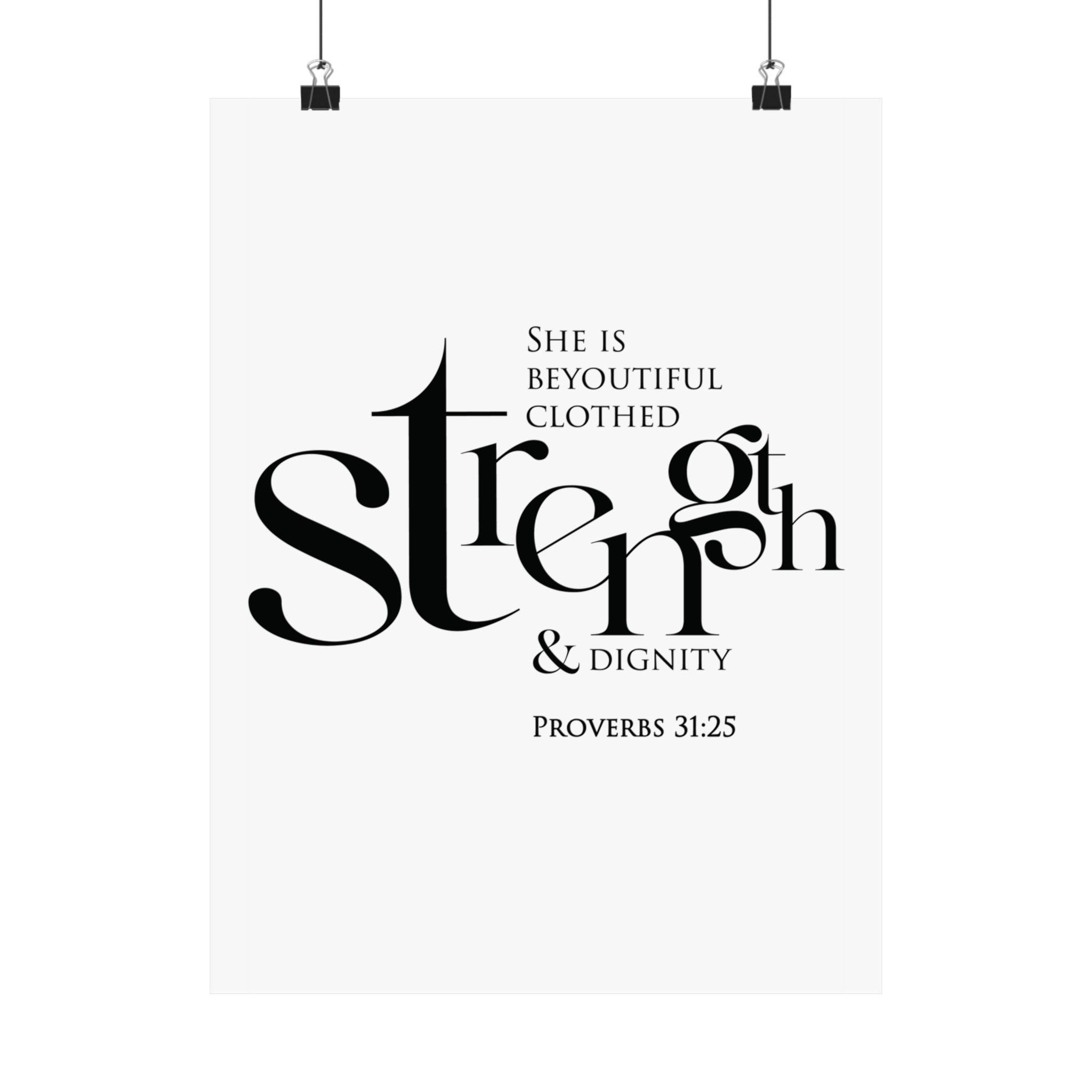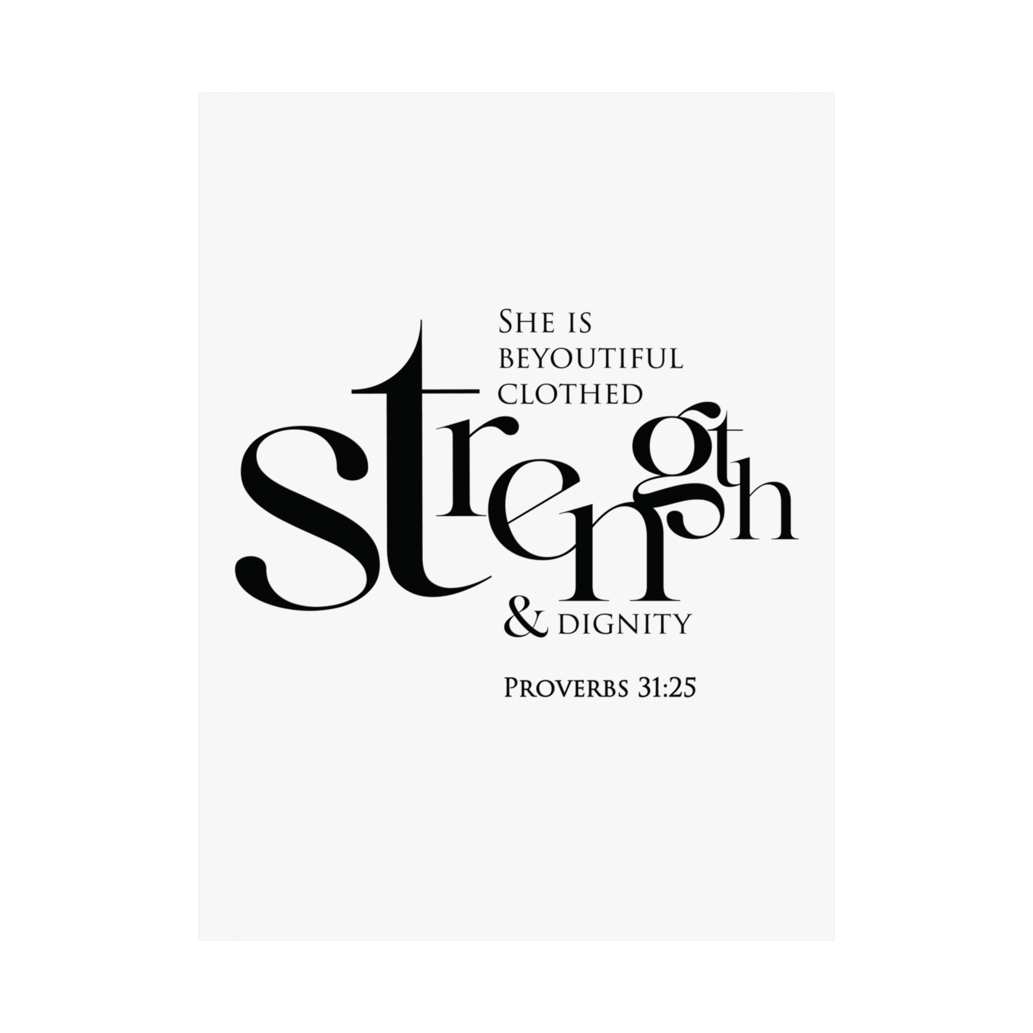 Feminine and confidence boosting, this matte vertical poster highlights Proverbs 31:25 with the phrase “She is clothed with strength and dignity,” plus the stylized wording shown in the artwork. The bold black and white typography creates a chic statement for bedrooms, closets, beauty corners, and home offices. A meaningful gift for birthdays, bridal showers, encouragement moments, and any woman growing in faith and confidence. Museum grade paper and giclée printing keep the details crisp and rich, while the matte finish stays soft and glare free. Available in 8 sizes.