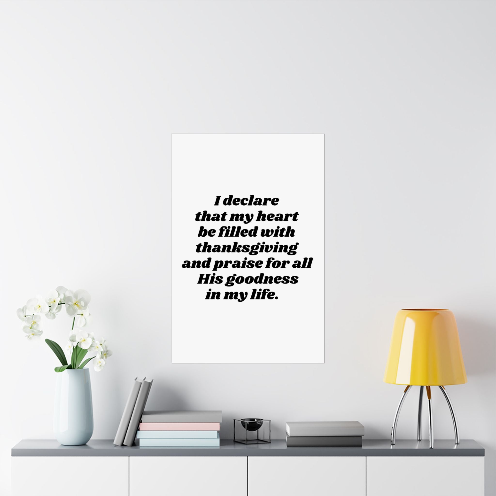 Fill your home with faith and gratitude through the Faith Culture Thanksgiving Declaration Matte Poster. With the inspiring words, βI declare that my heart be filled with thanksgiving and praise for all His goodness in my life,β this piece is a daily reminder to live with a heart full of praise.