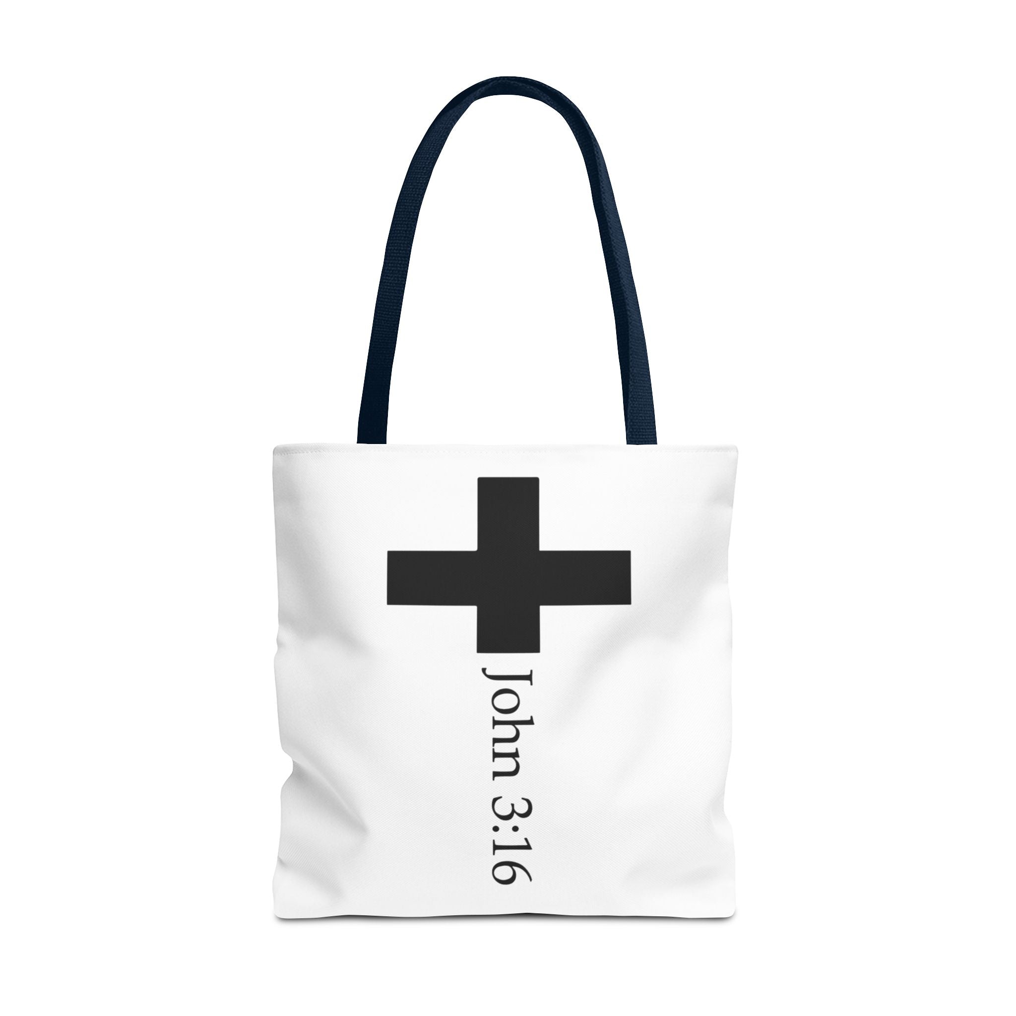 This lightweight tote carries quiet confidence. A bold black cross sits near the top, with “John 3:16” set vertically below, simple, reverent, and unmistakable. The clean white polyester body gives the graphic a modern backdrop, while the sturdy black handles add contrast and make it easy to carry on the go. Boxed corners expand the interior so your Bible, notebook, water bottle, or market finds fit comfortably without feeling crowded. Take it to church, Bible study, the library, or everyday errands, a minimal piece that holds your essentials and keeps your faith close.