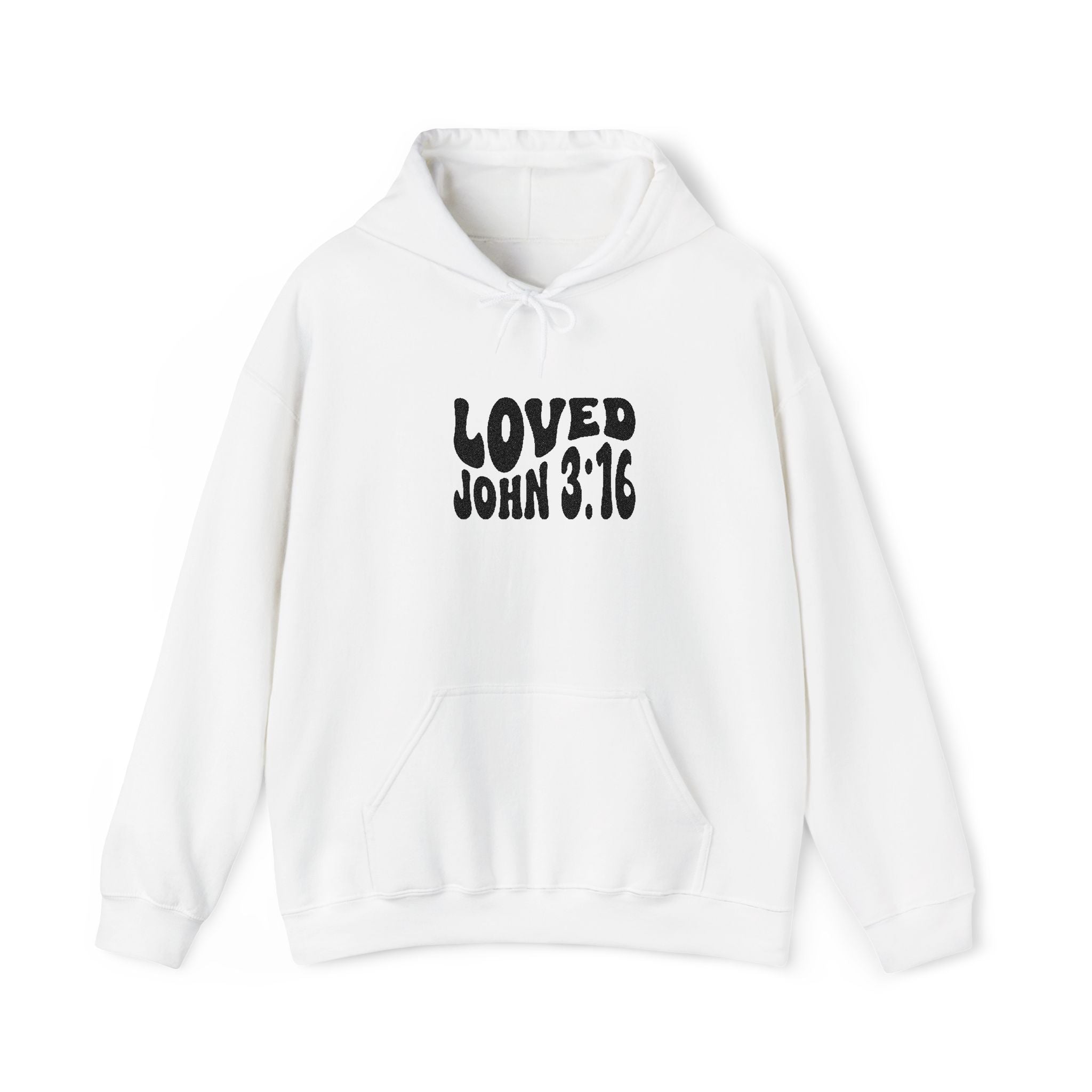 A soft, midweight hoodie that brings quiet comfort and steady faith to everyday life. The clean white fleece features bold, hand lettered text that reads “LOVED” with “John 3:16” beneath, simple and sincere like a whispered reminder you can wear. Reach for it on slow mornings, after church, during study nights, or layered under a coat on cool evenings. With a roomy kangaroo pocket and a double lined hood, it feels lived in from the first wear, made for anyone who wants faith expressed gently through simple, wearable design.