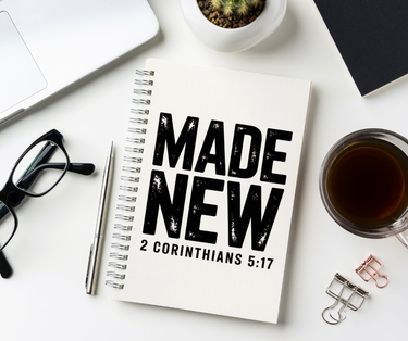 Small, practical, and quietly meaningful, this Faith Culture spiral notebook carries a simple message of renewal right on the cover. The bold distressed “MADE NEW” design with 2 Corinthians 5:17 sits on a clean white front, creating a minimalist look that feels steady and faith forward. It is a simple place to write prayers, sermon notes, gratitude lists, and everyday thoughts as you walk through a new season.
