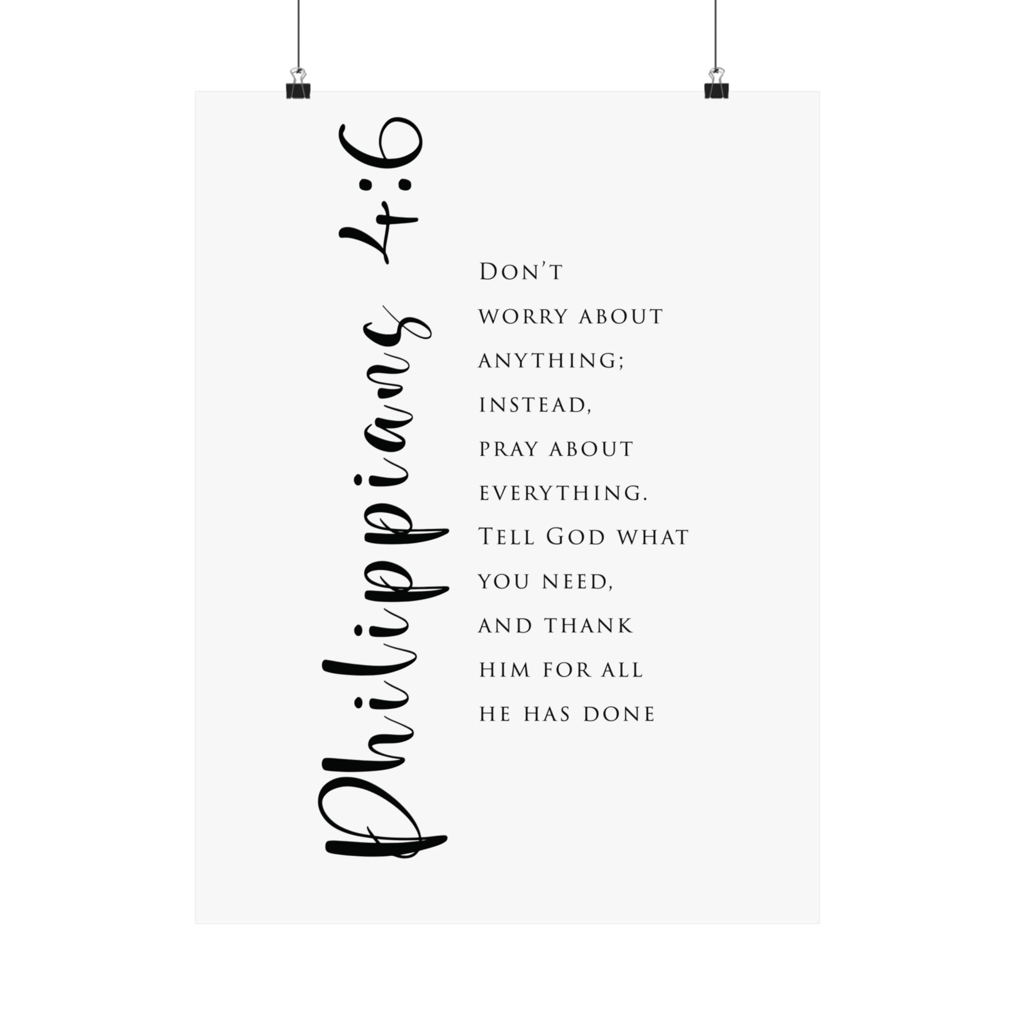 Peaceful and practical, this matte vertical poster features a bold “Philippians 4:6” script alongside the reminder to pray instead of worry. The clean, minimalist layout makes it a steady encouragement for anxious days and a beautiful prompt to bring everything to God.