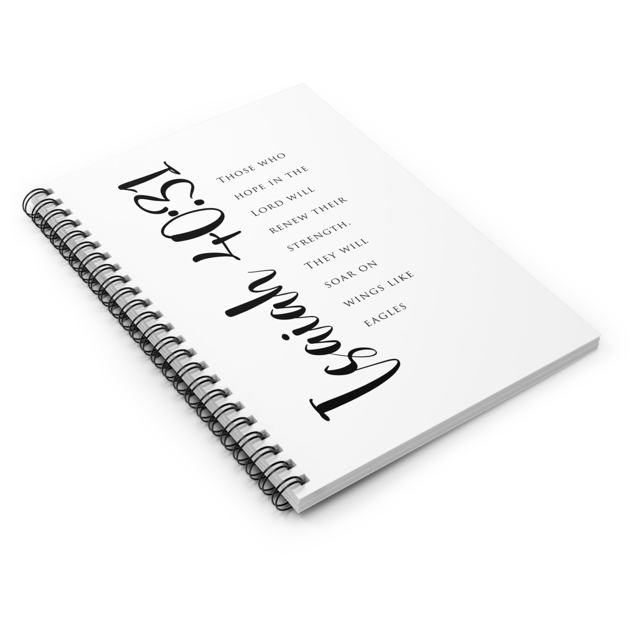 A calm, minimalist spiral journal designed for the season when you need fresh strength. The cover pairs a bold vertical Isaiah 40:31 with the promise beside it: those who hope in the Lord will renew their strength and soar on wings like eagles. It reads like a quiet lift for the heart, steady and unwavering.