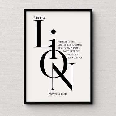 Adorn your home with the powerful imagery of our Faith Culture vertical framed wall art, featuring Proverbs 30:30. This stunning piece displays the majestic scripture, "A lion, mighty among beasts, who retreats before nothing," serving as a reminder of courage, strength, and unwavering confidence.