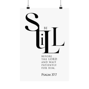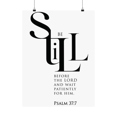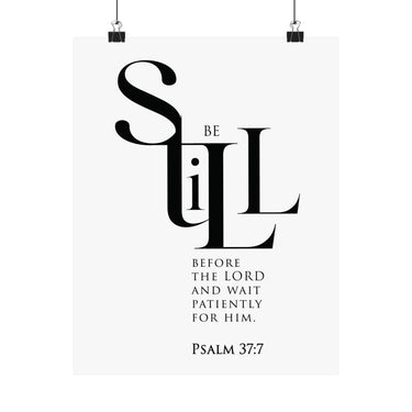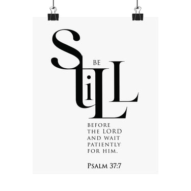 Quiet and grounding, this matte vertical poster features “Be Still” in bold, elegant typography with the scripture reminder from Psalm 37:7 to wait patiently for the Lord. The high contrast black and white design and clean spacing create a peaceful look that fits almost any room.