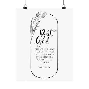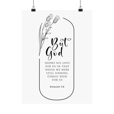 Bold and deeply meaningful, this matte vertical poster features “But God” in oversized script typography, paired with Romans 5:8: “But God shows his love for us in that while we were still sinners, Christ died for us.” The arched frame and botanical accents feel modern, reverent, and easy to style.