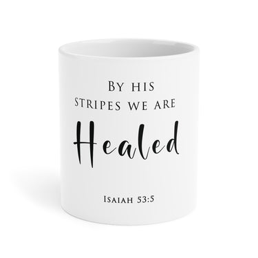 A calm white ceramic mug featuring Isaiah 53:5 in bold, minimalist black type. “Healed” appears larger and more prominent, drawing your eyes to the promise at the center of the verse. It’s a steady reminder of Jesus’ sacrifice and the hope we carry, even when the body is tired and the heart feels worn.