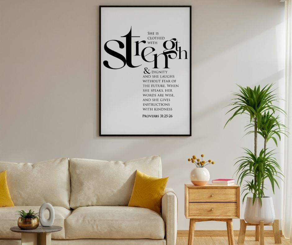 Celebrate wisdom and grace with our Faith Culture vertical framed wall art, featuring Proverbs 31:25-26. This beautiful piece displays the empowering scripture, "She is clothed with strength and dignity; she can laugh at the days to come. She speaks with wisdom, and faithful instruction is on her tongue," serving as a reminder of the virtuous and resilient spirit within us all.