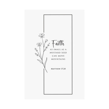 Bold and encouraging, this matte vertical poster features “Faith” in oversized script with the reminder that faith as small as a mustard seed can move mountains, paired with Matthew 17:20. The minimalist floral line art and clean typography make it a powerful statement without overwhelming your space.