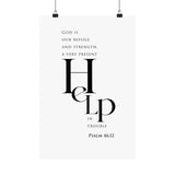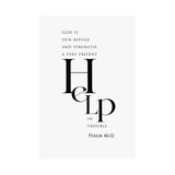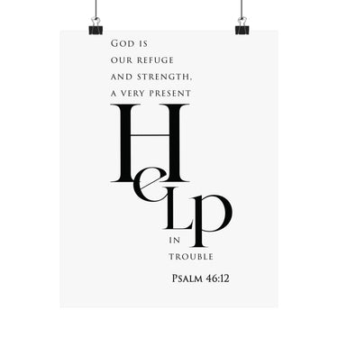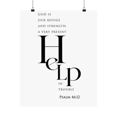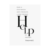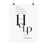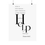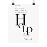 Bold and steady, this matte vertical poster features “Help” in oversized serif type, paired with the comforting declaration: “God is our refuge and strength, a very present help in trouble.” The minimalist black and white layout makes this a strong statement piece with a calm, uncluttered feel.