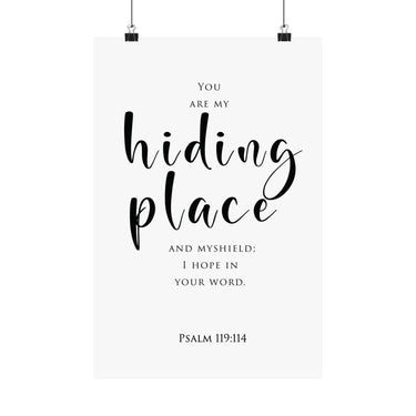 Quietly powerful, this matte vertical poster features “Hiding Place” in flowing script with Psalm 119:114 beneath, reminding you that God is your shelter and shield. The minimalist layout keeps the focus on comfort, protection, and hope in His Word.