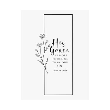 Soft and powerful, this matte vertical poster features delicate botanical line art with “His Grace is more powerful than our sin,” paired with Romans 6:14. The thin modern frame and black and white styling feel minimal, peaceful, and easy to style.