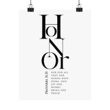 Bold and affirming, this matte vertical poster features “Honor” in dramatic stacked serif typography, paired with Proverbs 31:31: “Honor her for all that her hands have done, and let her works bring her praise.” The clean black and white composition feels elevated, feminine, and easy to style.