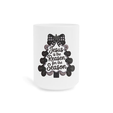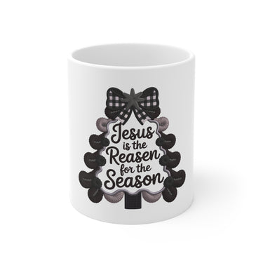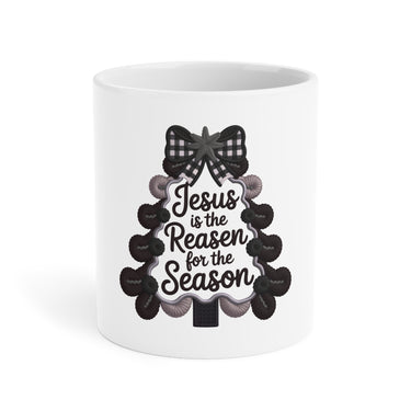 Keep your focus on the heart of Christmas with this “Jesus Is the Reason for the Season” mug. The message is framed inside a stylized Christmas tree wrapped in knit-texture branches and topped with a gingham bow. Neutral black, grey, and soft tones make it perfect for a minimalist, faith-filled home.