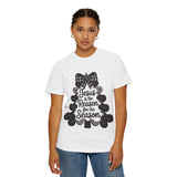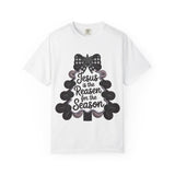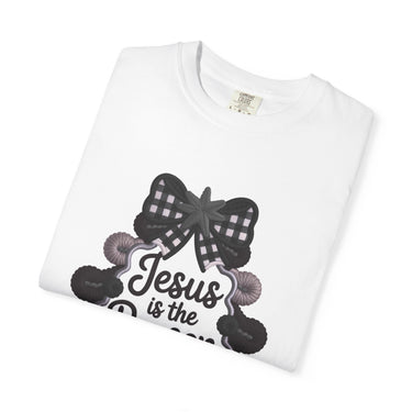 Shaped like a Christmas tree and topped with a gingham bow, the phrase “Jesus is the Reason for the Season” grows upward in soft script. Branch-like knit textures frame the words, giving this Christian Christmas t-shirt a cozy, handcrafted look in neutral black and grey. The garment-dyed cotton tee feels gently broken-in, perfect for layering under flannels, cardigans, or denim jackets.