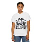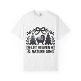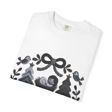Inspired by the carol “Joy to the World,” this Let Heaven and Nature Sing Christian Christmas t-shirt captures a peaceful nativity moment. Baby Jesus rests in a manger surrounded by knit-texture trees, songbirds, and florals, all framed by a soft bow in black and grey. The garment-dyed tee is gentle on the skin and feels like an old favorite from the first wear.