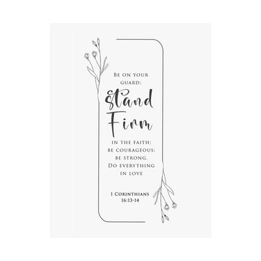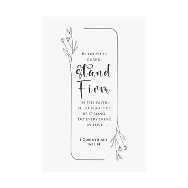 Strong and motivating, this matte vertical poster features “Stand Firm” in bold script typography, paired with 1 Corinthians 16:13–14: “Be on your guard; stand firm in the faith; be courageous; be strong. Do everything in love.” The clean black and white layout makes a confident statement without overpowering your décor.