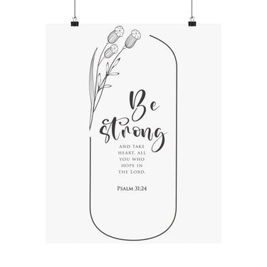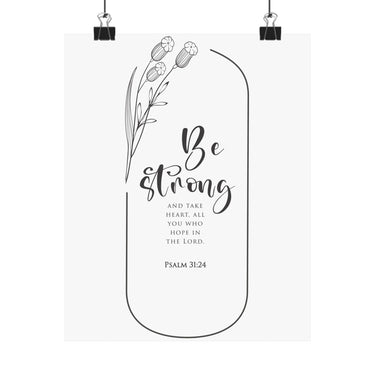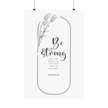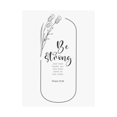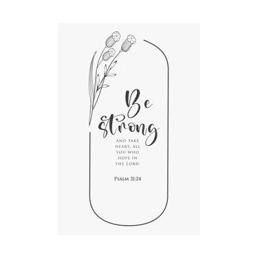 Bold and motivating, this matte vertical poster features Psalm 31:24: “Be strong and take heart, all you who hope in the Lord.” The clean black and white typography with simple botanical accents makes a strong statement for offices, classrooms, entryways, and prayer corners. A meaningful gift for graduates, new jobs, leadership seasons, and anyone who needs courage rooted in faith. Museum grade paper and giclée printing keep the details crisp and rich, while the matte finish stays soft and glare free. Available in 8 sizes.