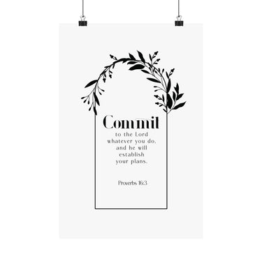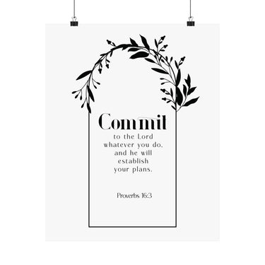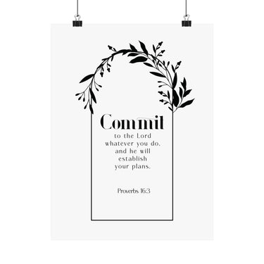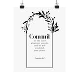 Hopeful and steady, this matte vertical poster features “Commit” in bold type, framed by a graceful botanical wreath. Proverbs 16:3 sits beneath in clean, centered lines, making this piece a daily reminder to place your plans in God’s hands and trust His direction.