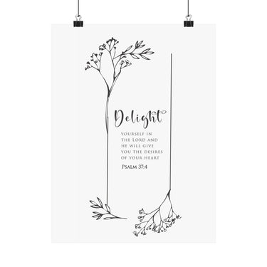 Gentle and inspiring, this matte vertical poster features Psalm 37:4: “Delight yourself in the Lord and He will give you the desires of your heart.” The clean black and white design with floral line art adds a soft, faith filled touch to bedrooms, offices, and devotional spaces. A beautiful gift for engagement seasons, new beginnings, prayer goals, and anyone trusting God with their desires. Museum grade paper and giclée printing keep the design crisp and refined, while the matte finish reduces glare for a soft, modern look. Available in 8 sizes.