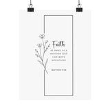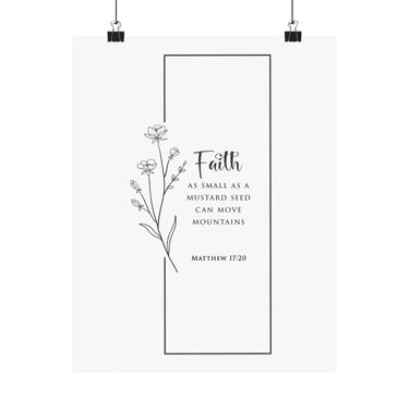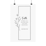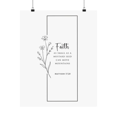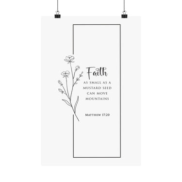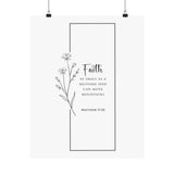 Bold and encouraging, this matte vertical poster features “Faith” in oversized script with the reminder that faith as small as a mustard seed can move mountains, paired with Matthew 17:20. The minimalist floral line art and clean typography make it a powerful statement without overwhelming your space.