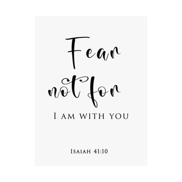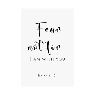 Simple and comforting, this matte vertical poster features “Fear not” in flowing hand lettered script, paired with the steady promise “I am with you” and the reference Isaiah 41:10. The clean black and white layout and airy spacing make the message feel calm, modern, and easy to style.