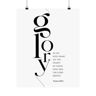 Worship centered and encouraging, this matte vertical poster features “glory” typography with Psalm 105:3, calling hearts to rejoice as they seek the Lord. The black and white minimalist layout makes it a clean, modern addition to living rooms, offices, church spaces, and prayer corners. A thoughtful gift for worship teams, pastors, Bible study friends, or anyone building a home that reflects faith and joy. Museum grade paper and giclée printing keep every line sharp and the blacks richly saturated, while the matte finish stays soft and glare free. Available in 8 sizes for easy styling.