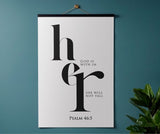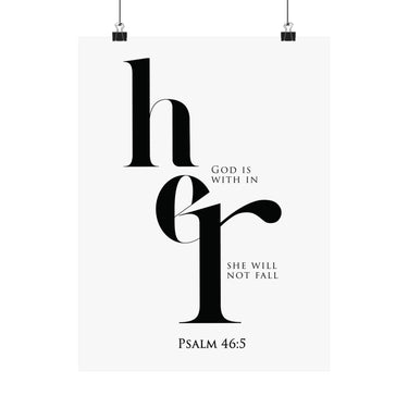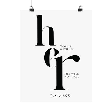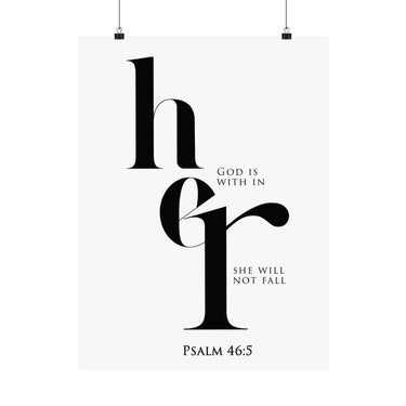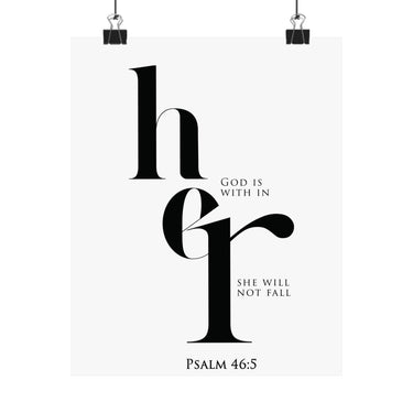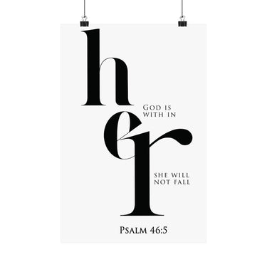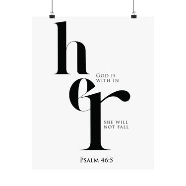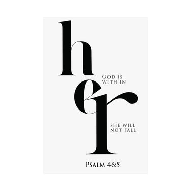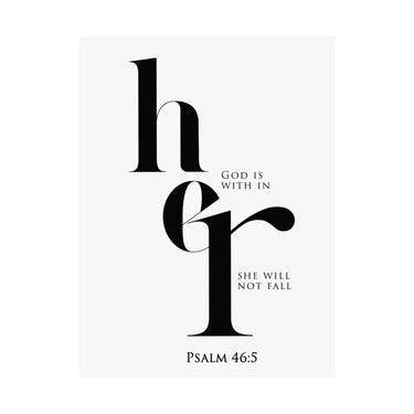 Strength filled and steady, this matte vertical poster features elegant “her” typography with the promise “God is within her, she will not fall,” paired with Psalm 46:5. The high contrast black and white design feels modern and bold, perfect for bedrooms, prayer corners, dorm rooms, and offices. A thoughtful gift for encouragement, new beginnings, graduations, baptism, or a friend walking through a hard season. Museum grade paper and giclée printing preserve crisp edges and deep blacks, and the matte finish stays smooth and glare free. Available in 8 sizes for easy styling.