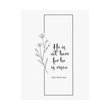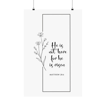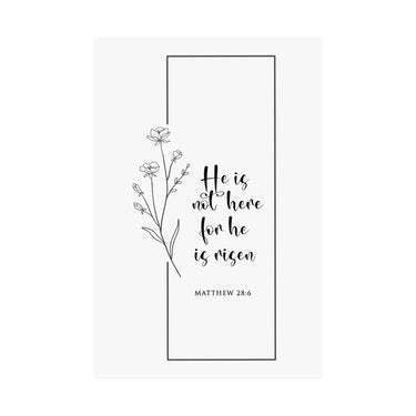 Simple and triumphant, this matte vertical poster declares the heart of the Gospel with “He is not here for he is risen,” paired with Matthew 28:6. The minimalist black and white layout and floral line art give it a modern, peaceful look that fits beautifully year round, not just at Easter.