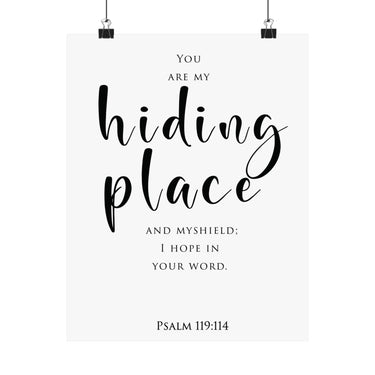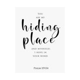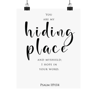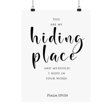 Quietly powerful, this matte vertical poster features “Hiding Place” in flowing script with Psalm 119:114 beneath, reminding you that God is your shelter and shield. The minimalist layout keeps the focus on comfort, protection, and hope in His Word.