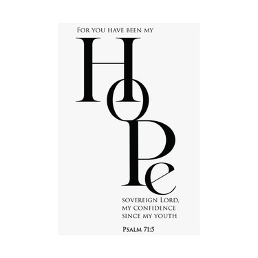 Hopeful and steady, this matte vertical poster features Psalm 71:5: “For you have been my hope, Sovereign Lord, my confidence since my youth.” The black and white typography makes a meaningful statement for bedrooms, offices, hallways, and prayer spaces, pointing your heart back to God’s faithfulness over time. A thoughtful gift for milestones, life transitions, and anyone rebuilding confidence in the Lord. Museum grade paper and giclée printing keep the design crisp and rich, while the matte finish stays soft and glare free. Available in 8 sizes.