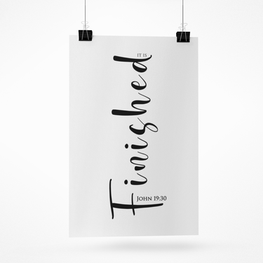 Simple, bold, and powerful, this matte vertical poster features “It is finished” in striking vertical script paired with John 19:30. The clean black and white typography makes a strong statement of faith and redemption while staying modern and minimal.
