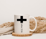 A simple, reverent ceramic mug that brings a quiet moment of faith to your morning routine. The clean white surface showcases a bold black cross with “John 3:16” printed beneath it, creating a minimalist design that feels calm and meditative. Hold it by the comfortable C-handle as warm coffee or tea becomes a small daily ritual, an everyday reminder of hope and grace. The glossy finish and crisp print help the symbol stand out beautifully, whether it is sitting on your kitchen counter, church fellowship table, or office desk.