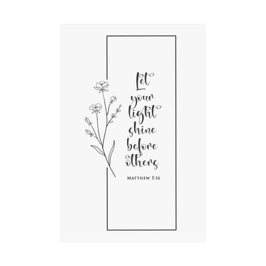 Bright and purpose filled, this matte vertical poster features “Let your light shine before others” in graceful hand lettered script, paired with Matthew 5:16. The clean black and white composition with a minimalist floral accent makes it an easy fit for modern homes and faith inspired workspaces.