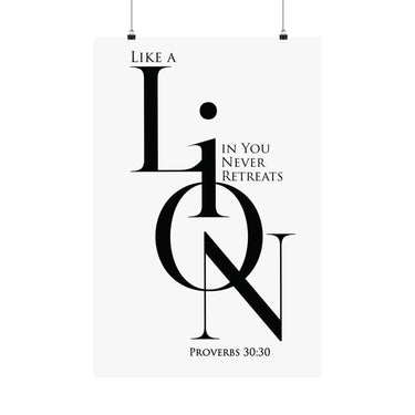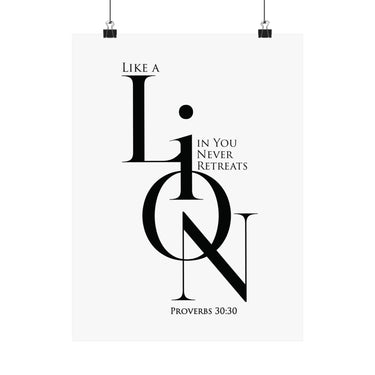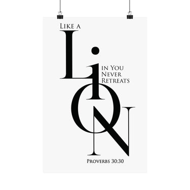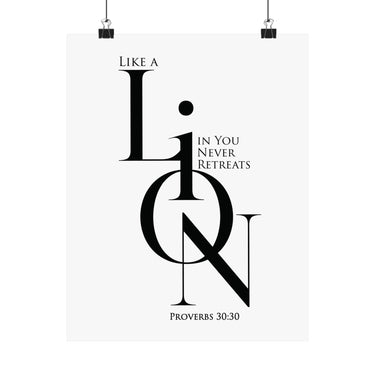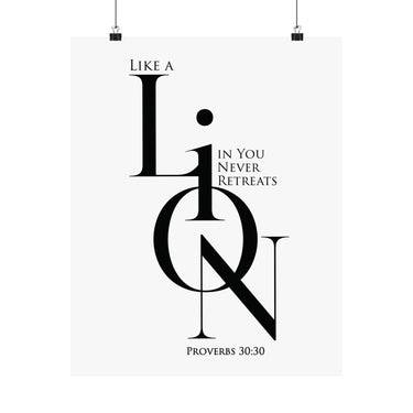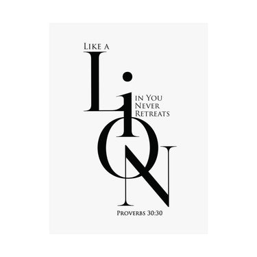 Bold and motivational, this matte poster pairs Proverbs 30:30 inspiration with a strong “LION” design and an empowering message about courage that does not retreat. The black and white minimalist look keeps it modern and versatile, making it ideal for offices, dorm rooms, teen spaces, and goal focused corners of your home. A meaningful gift for encouragement, new beginnings, and faith filled confidence.