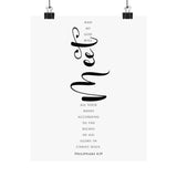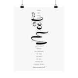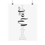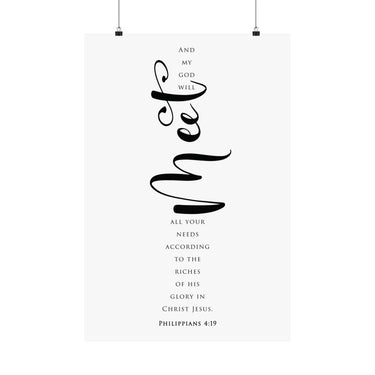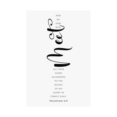 Bold and faith filled, this matte vertical poster highlights the word “Supply” in expressive script, with the full scripture message from Philippians 4:19 arranged in clean, centered lines beneath. The balanced typography and minimalist black and white style create a striking reminder of God’s provision.