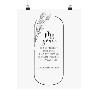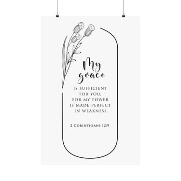 Gentle strength for hard days, this matte vertical poster features “My grace is sufficient for you, for my power is made perfect in weakness” paired with 2 Corinthians 12:9. The black and white minimalist design with floral line art keeps the message clear, comforting, and easy to style.