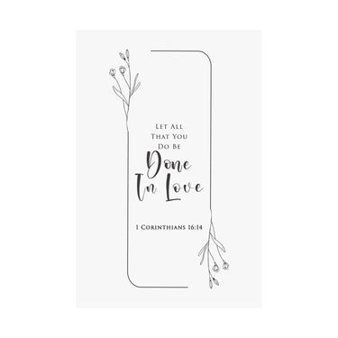 Bold and encouraging, this matte vertical poster features “Let all that you do be done in love” with “One In Love” in oversized script, paired with 1 Corinthians 16:14. The minimalist black and white design and floral line art add a gentle, faith filled touch without feeling busy.
