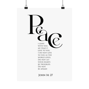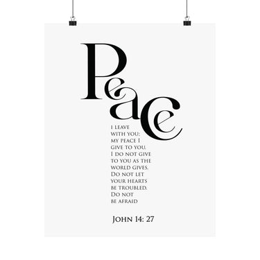 Calm and grounding, this matte vertical poster features “Peace” in bold modern typography with the promise of John 14:27. The clean black and white layout feels soothing and uncluttered, creating a quiet moment of peace in any room.