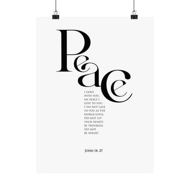 Quiet, elegant, and thoughtfully designed, this matte vertical poster brings a moment of calm into any room. Oversized black lettering spells “Peace” in a refined, modern style, with a centered scripture passage beneath it from John 14:27. The clean white background and high contrast design create a gentle focal point that fits beautifully in bedrooms, prayer corners, reading nooks, or entryways.