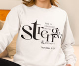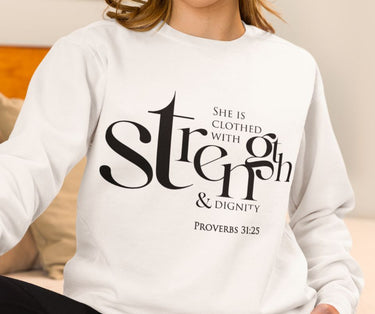 Emblazoned with the empowering verse from Proverbs 31:25, it serves as a daily affirmation of strength and dignity. Whether you're embracing leisure at home or venturing out, this sweatshirt ensures unmatched comfort and versatility. Its relaxed fit and classic crewneck design make it a staple for individuals of all genders, ideal for personal wear or as a heartfelt gift.