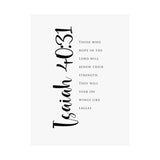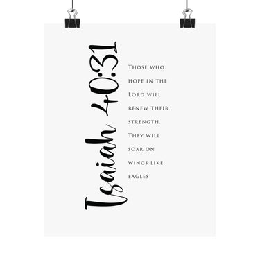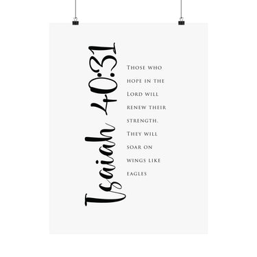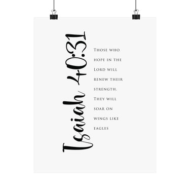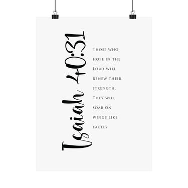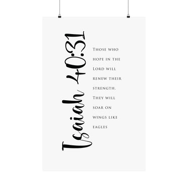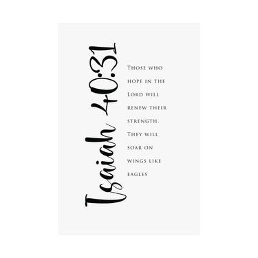 Hope filled and uplifting, this matte vertical poster features Isaiah 40:31: “Those who hope in the Lord will renew their strength. They will soar on wings like eagles.” The clean black and white typography with bold script details creates a strong statement for offices, gyms, bedrooms, and prayer corners. A meaningful gift for perseverance seasons, recovery journeys, and anyone trusting God for fresh strength. Museum grade paper and giclée printing keep the details crisp and rich, while the matte finish stays soft and glare free. Available in 8 sizes.
