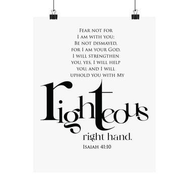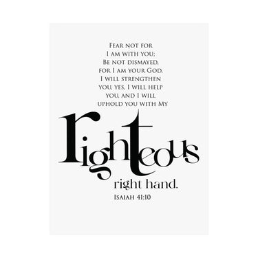 Strong and reassuring, this matte vertical poster features Isaiah 41:10: “Fear not, for I am with you… I will strengthen you… I will uphold you with My righteous right hand.” The striking black and white typography creates a bold, faith filled statement for hallways, offices, and prayer corners. A meaningful gift for healing seasons, hard transitions, and anyone believing God for strength and help. Museum grade paper and giclée printing keep the text crisp and rich, while the matte finish stays soft and glare free. Available in 8 sizes.