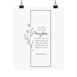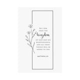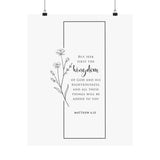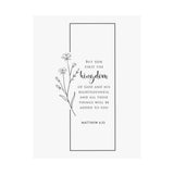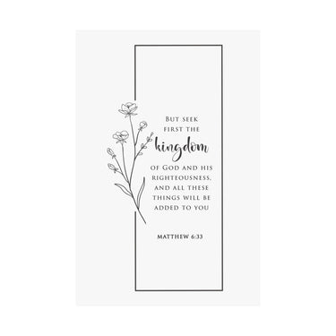 Clear and grounding, this matte vertical poster features “But seek first the kingdom of God and His righteousness” with Matthew 6:33. The minimalist black and white layout and floral line art keep the message front and center, making it easy to incorporate into any room.