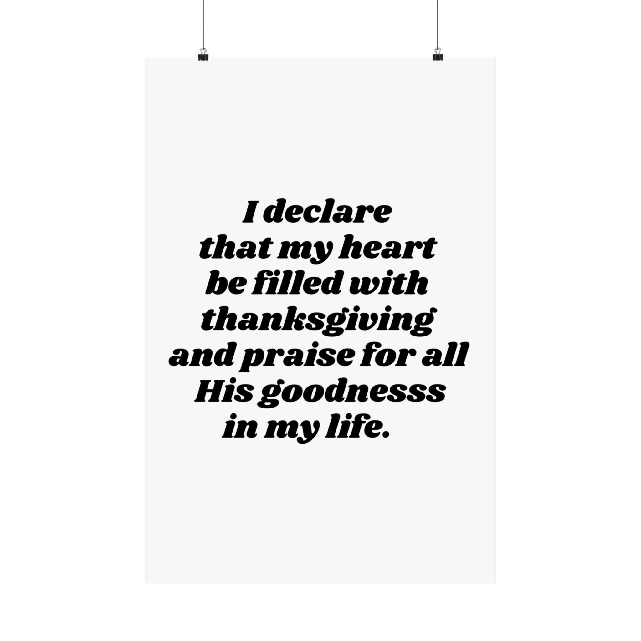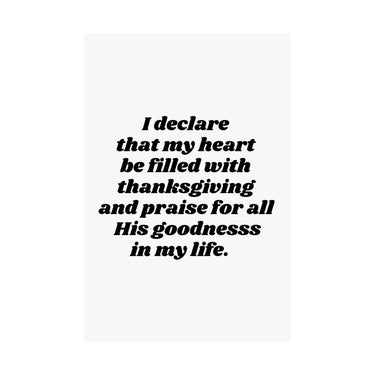 Fill your home with faith and gratitude through the Faith Culture Thanksgiving Declaration Matte Poster. With the inspiring words, “I declare that my heart be filled with thanksgiving and praise for all His goodness in my life,” this piece is a daily reminder to live with a heart full of praise.